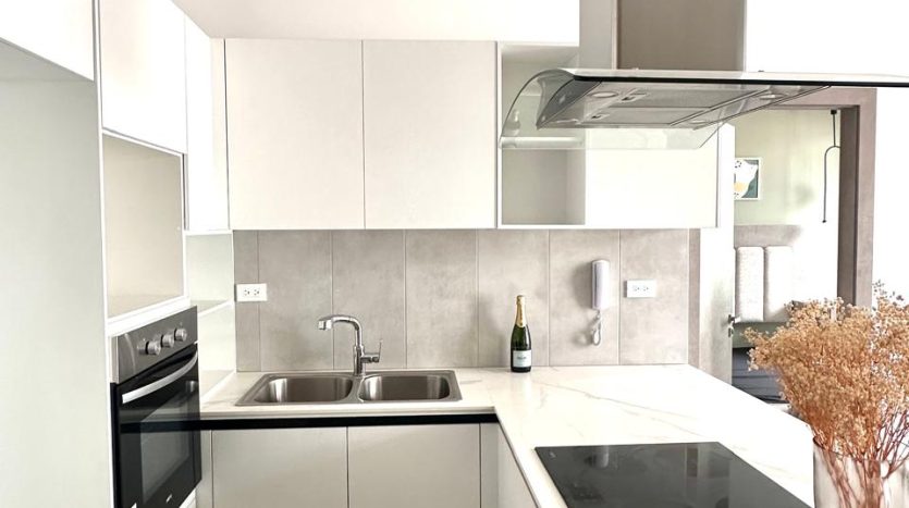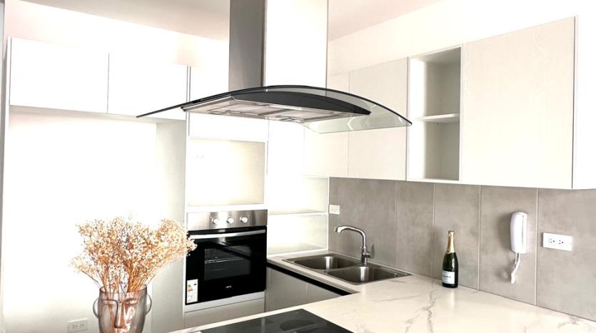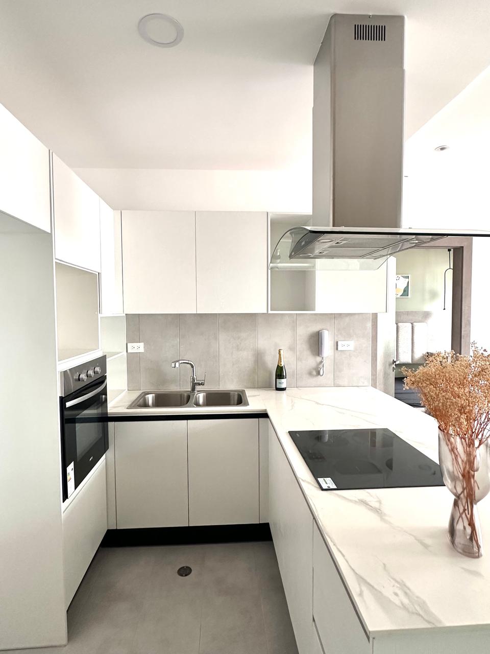– Cocina open space americana con muebles altos y bajos, horno, encimera y extractor campana de vidrio