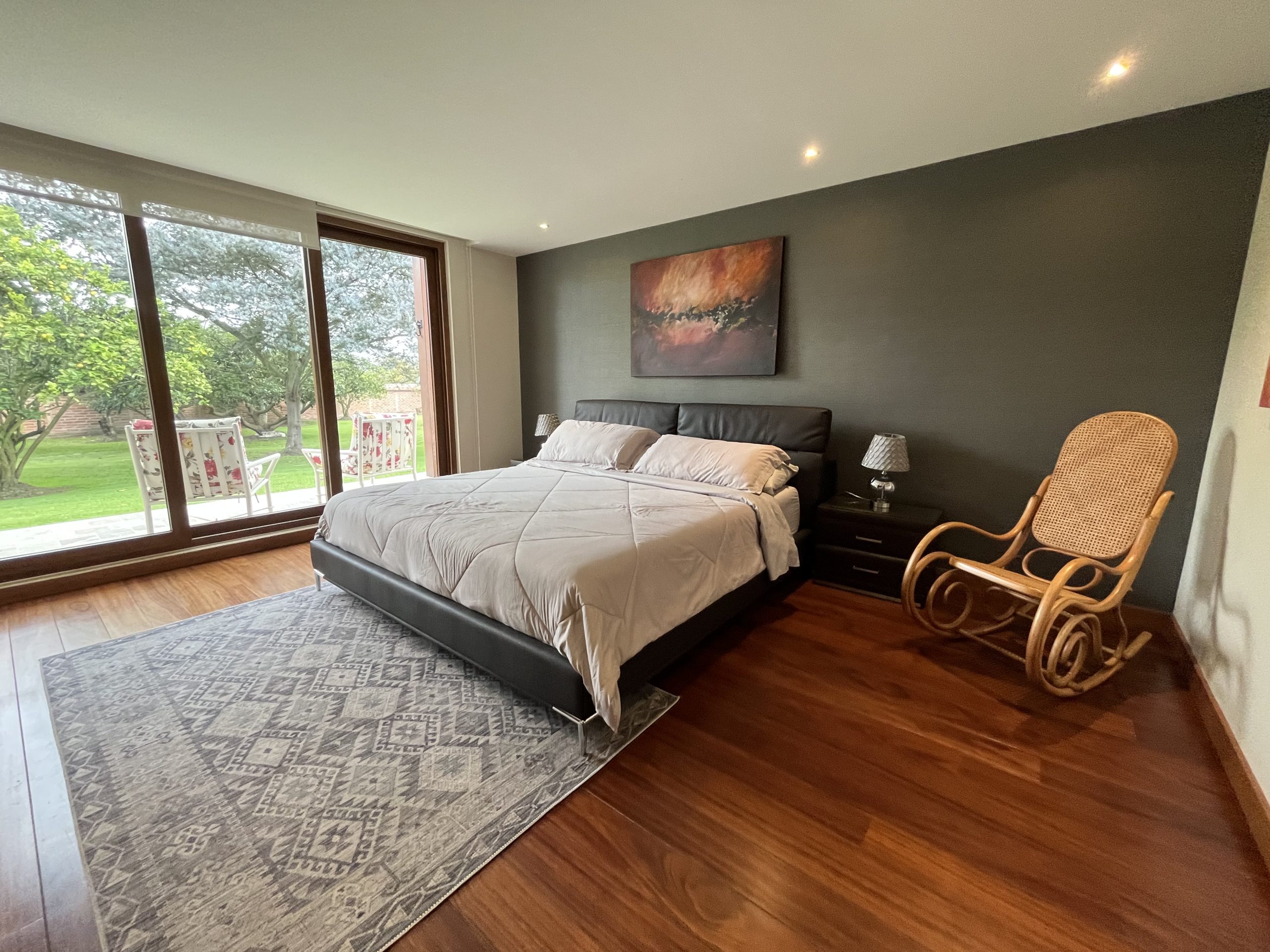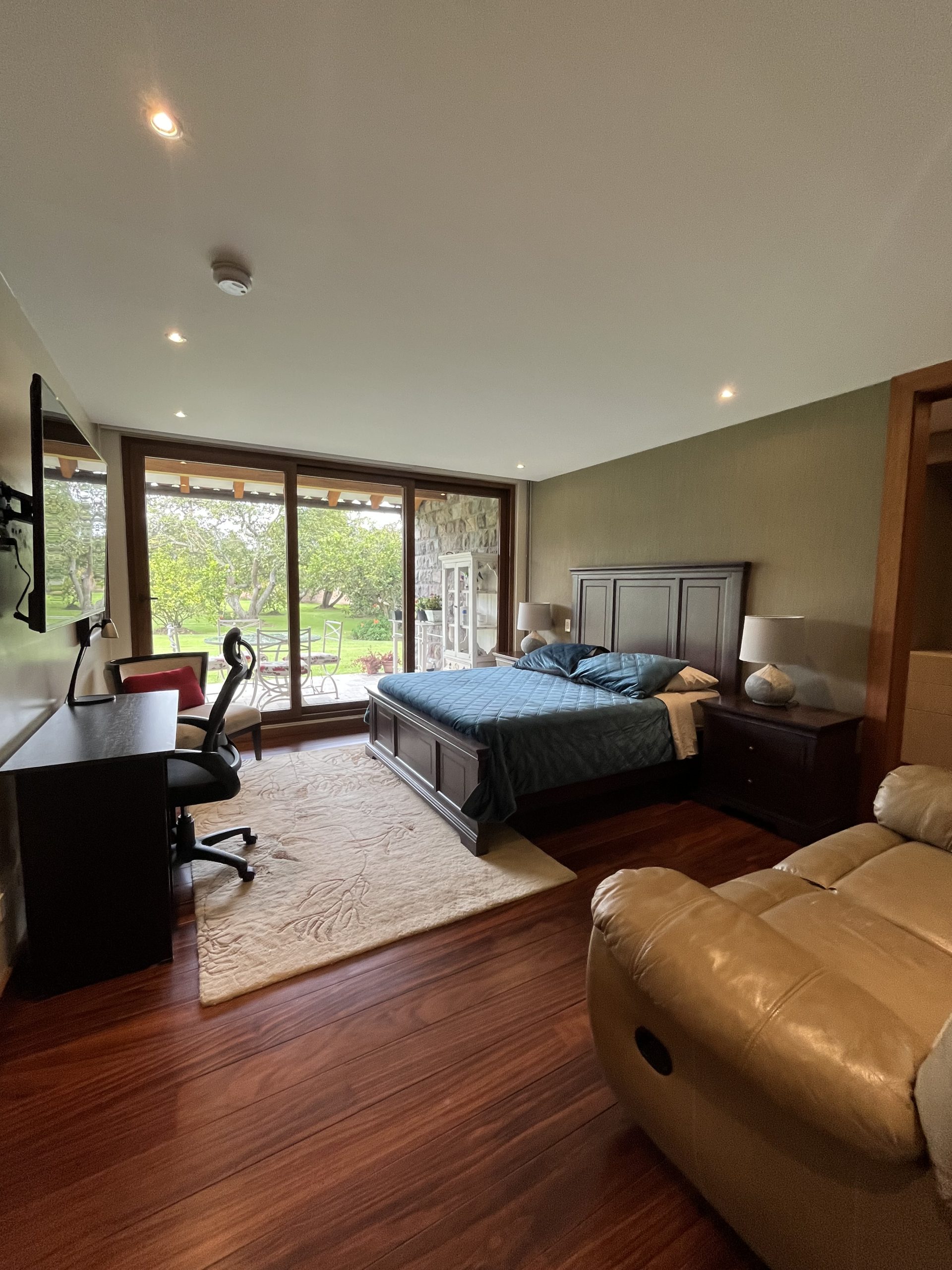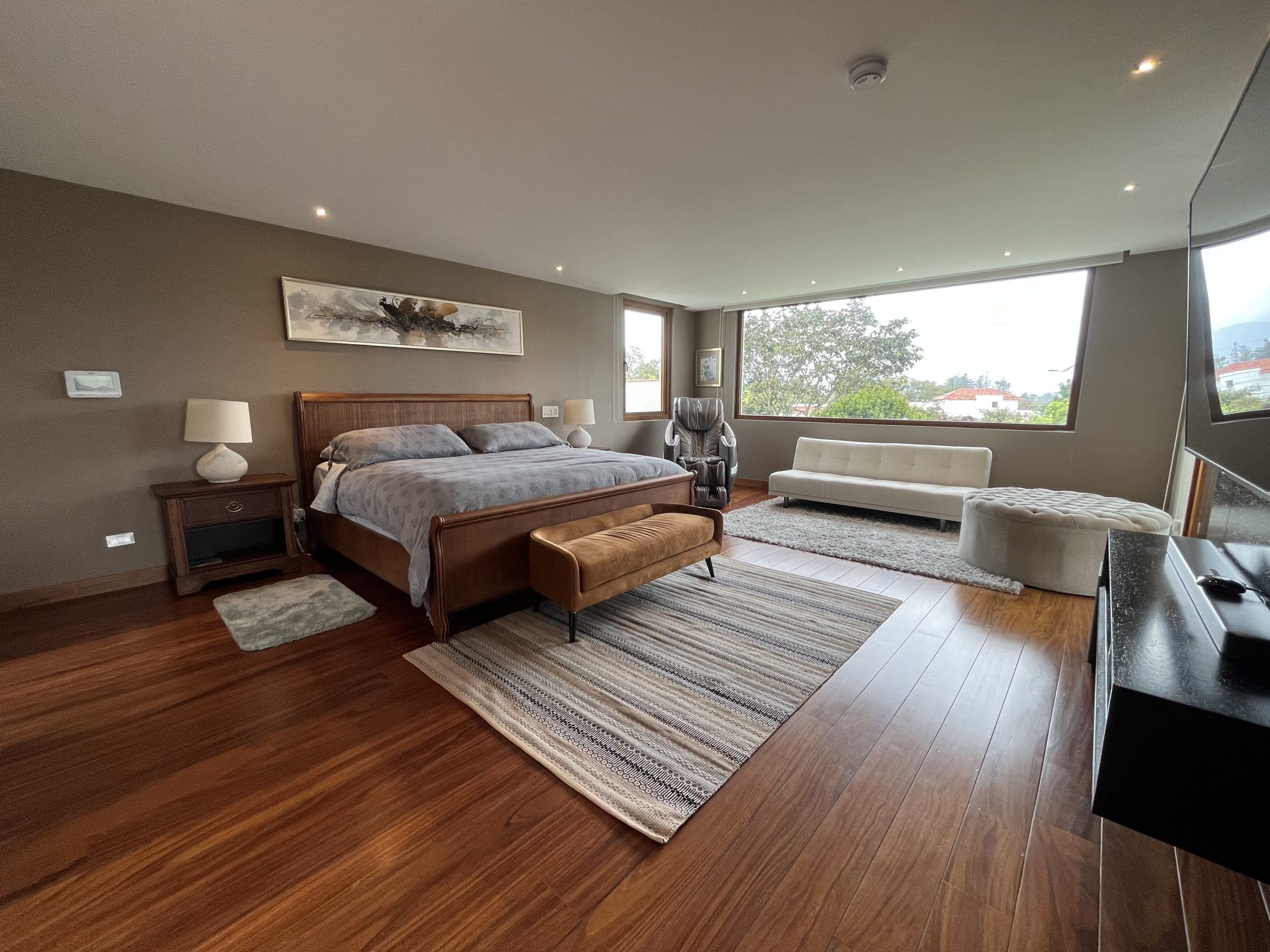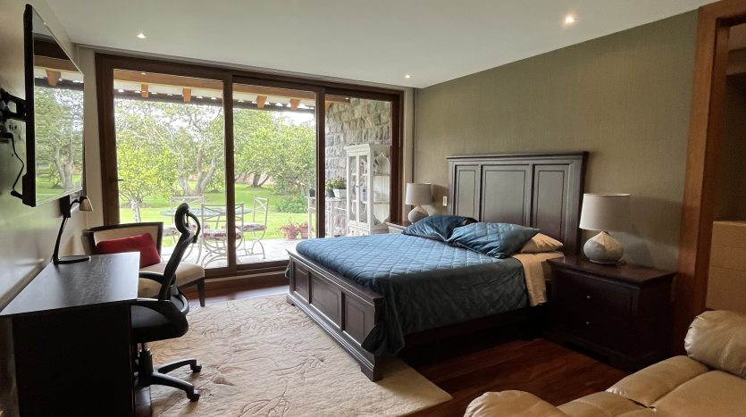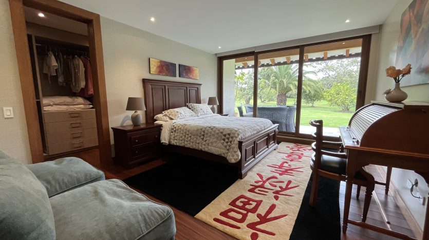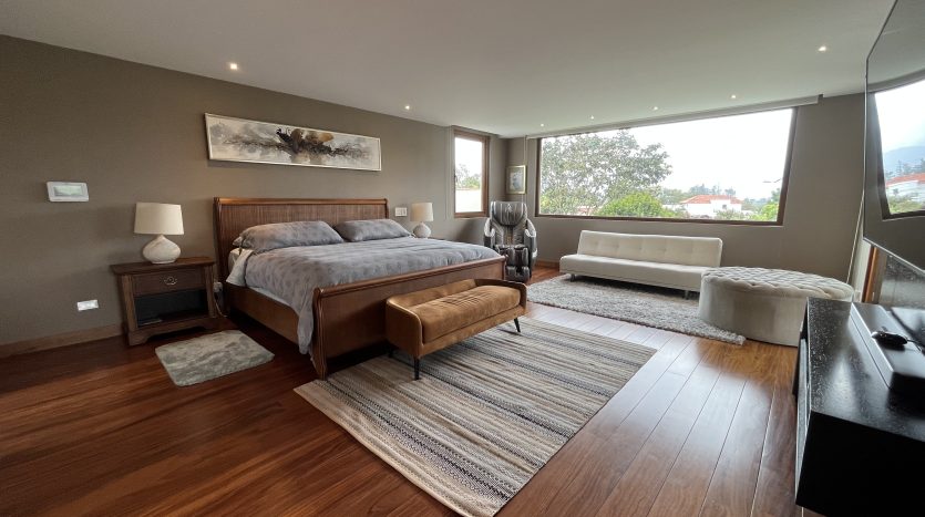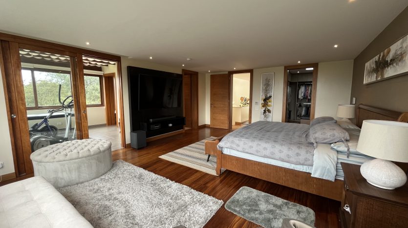 Habitación principal con vista panorámica al jardín, baño completo, walking closet espacioso, y un área privada de gimnasio y masajes.